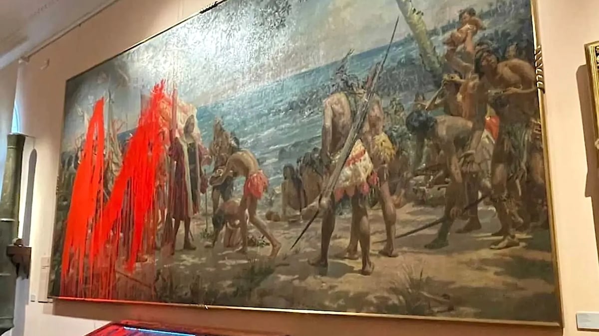 Two climate activists were arrested at the Museo Naval in Madrid after throwing biodegradable red paint over a painting depicting Christopher Columbus.