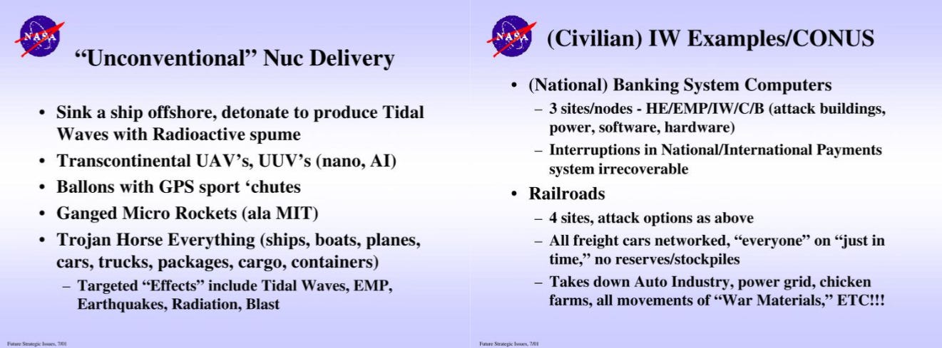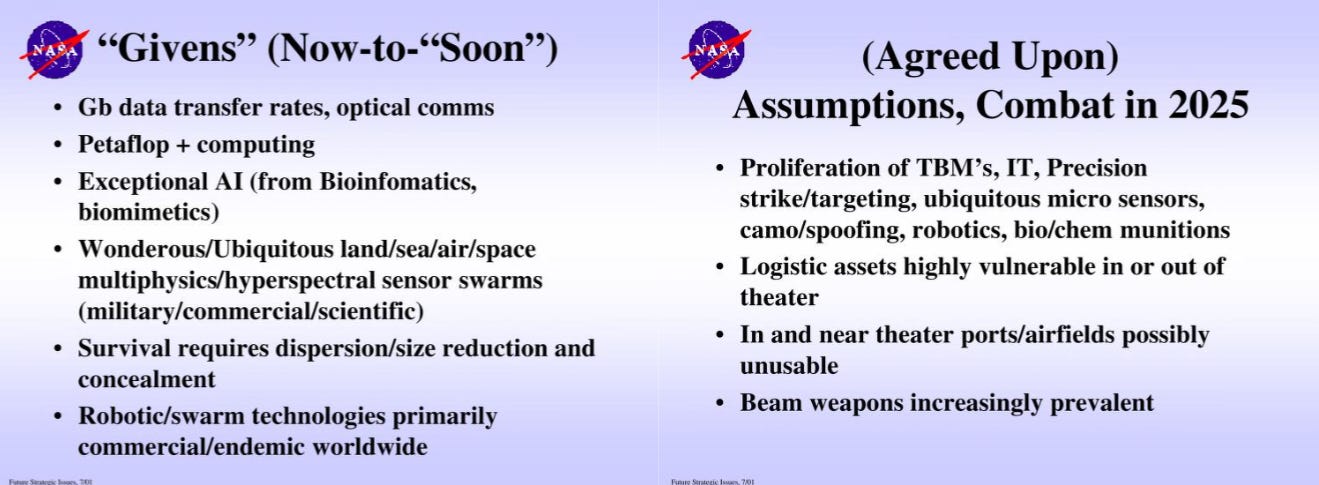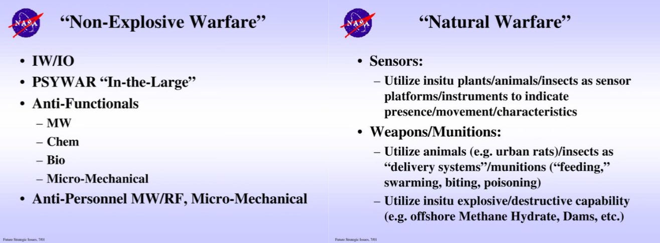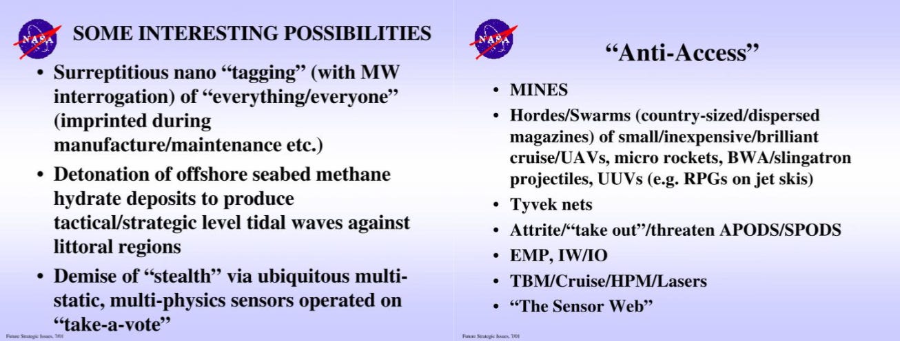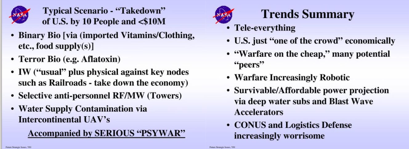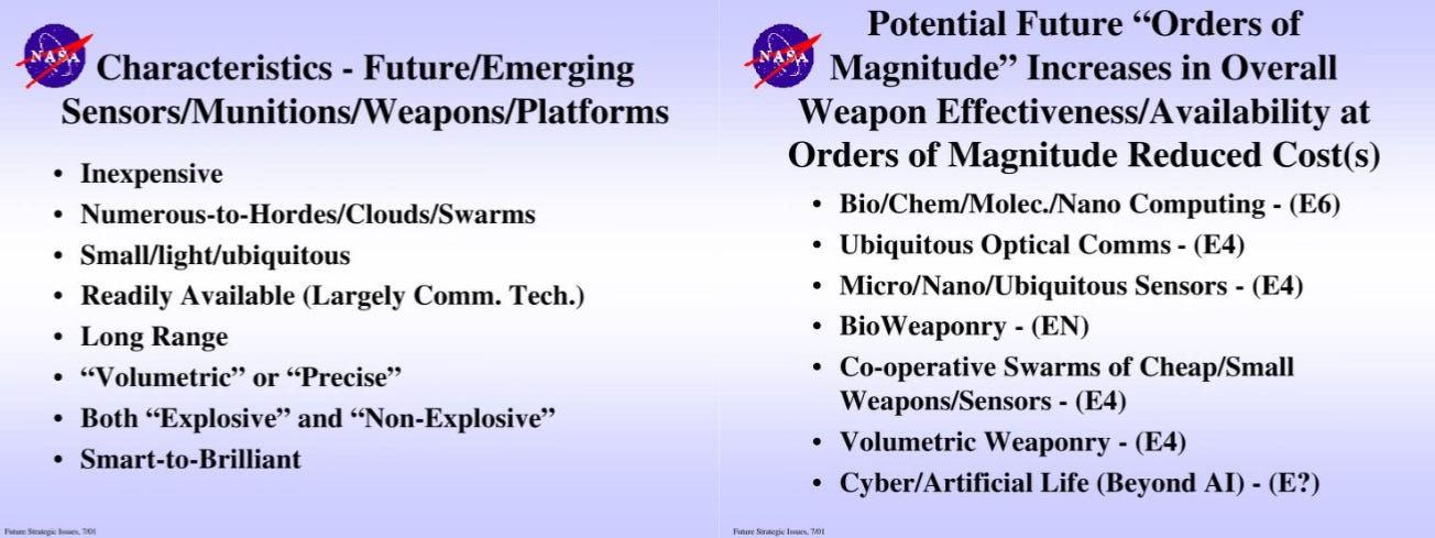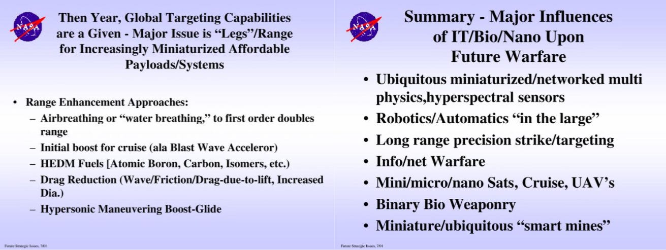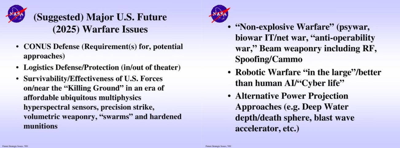 Dennis M. Bushnell, “Future Strategic Issues/Future Warfare [Circa 2025]” (sic), NASA Langley Research Center (National Aeronautics and Space Administration), July 2001, 113 pp.; PDF, 1400357 bytes, MD5: c833f3fbc55d07fe891f5f4df5fb2f57. The aforesaid PDF was found on the US Department of Defense’s Defense Technical Information Center (DTIC) website, as archived by the following Internet Archive URL: http://wayback.archive.org/web/20031224161719/http://www.dtic.mil/ndia/2001testing/bushnell.pdf