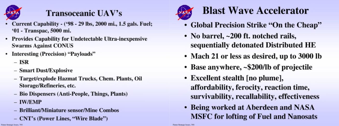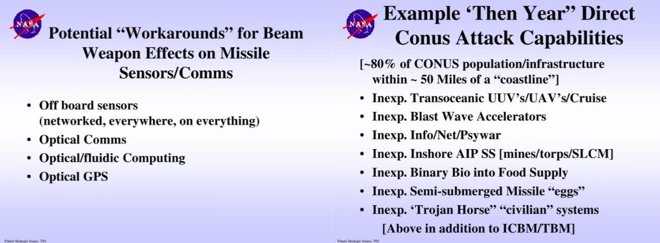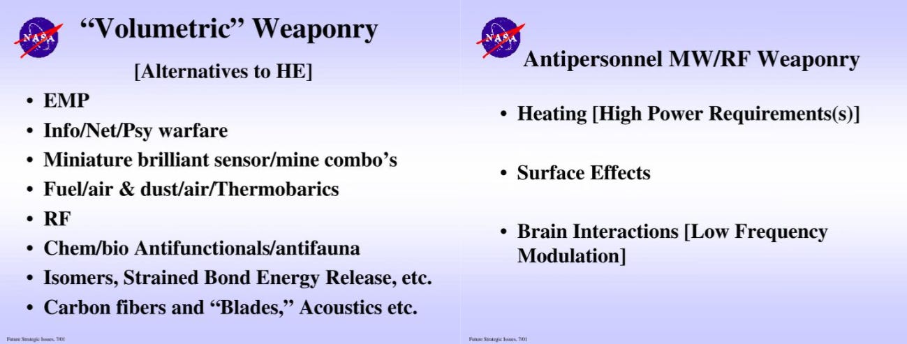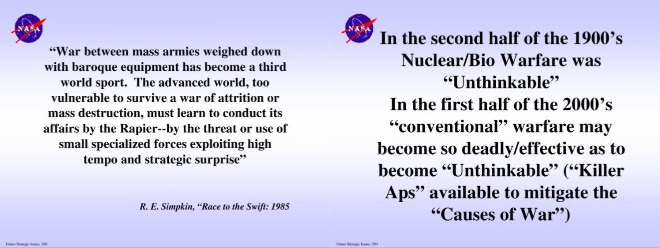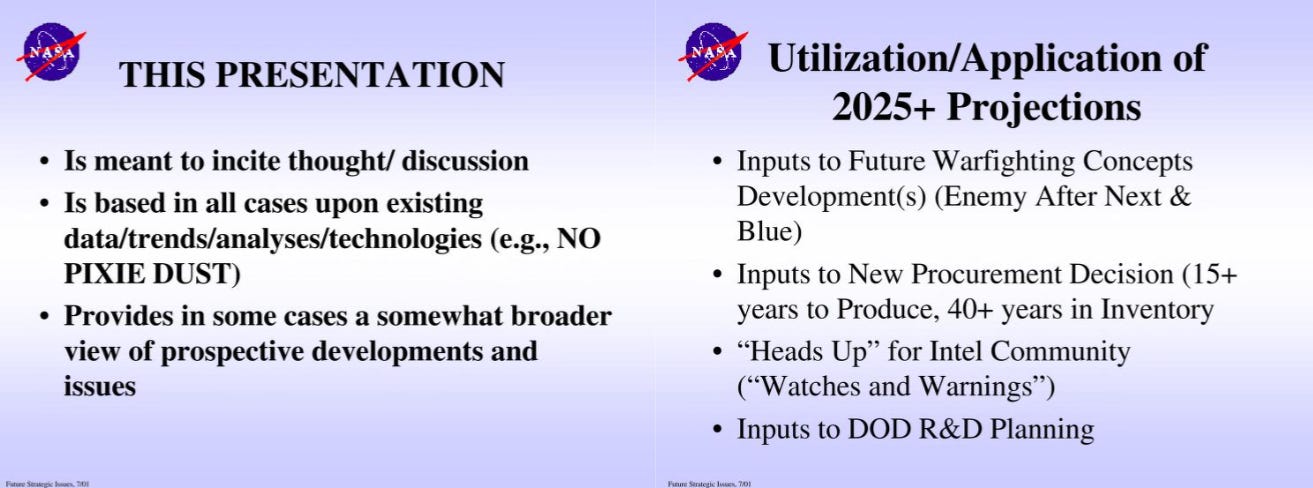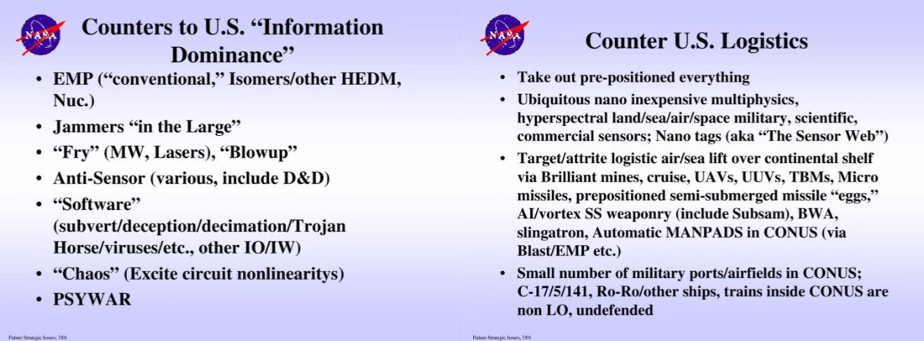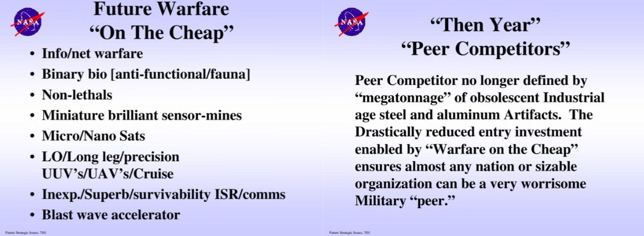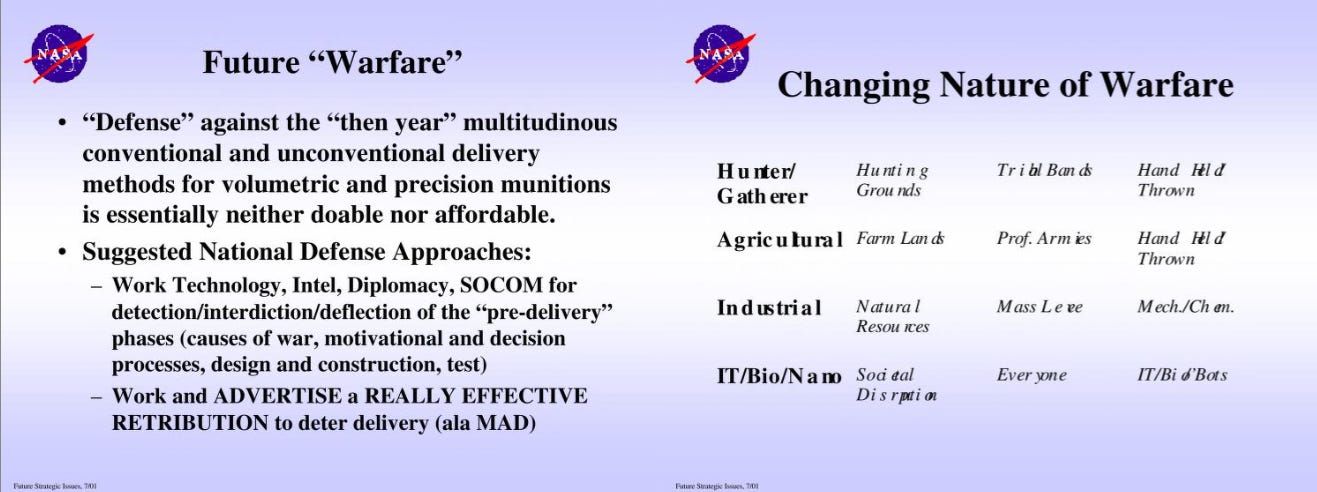Dennis M. Bushnell, “Future Strategic Issues/Future Warfare [Circa 2025]” (sic), NASA Langley Research Center (National Aeronautics and Space Administration), July 2001, 113 pp.; PDF, 1400357 bytes, MD5: c833f3fbc55d07fe891f5f4df5fb2f57. The aforesaid PDF was found on the US Department of Defense’s Defense Technical Information Center (DTIC) website, as archived by the following Internet Archive URL: http://wayback.archive.org/web/20031224161719/http://www.dtic.mil/ndia/2001testing/bushnell.pdf
