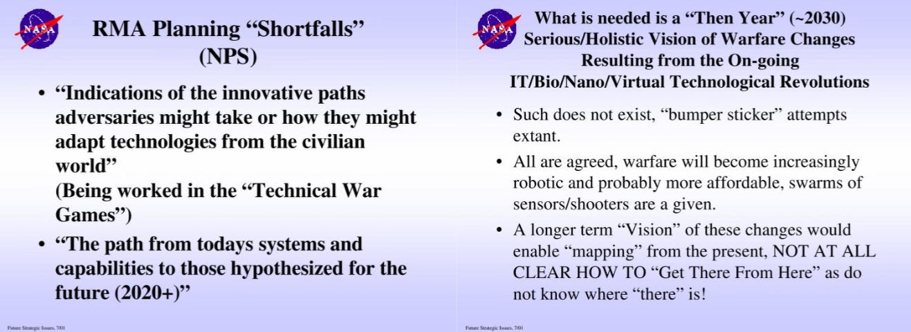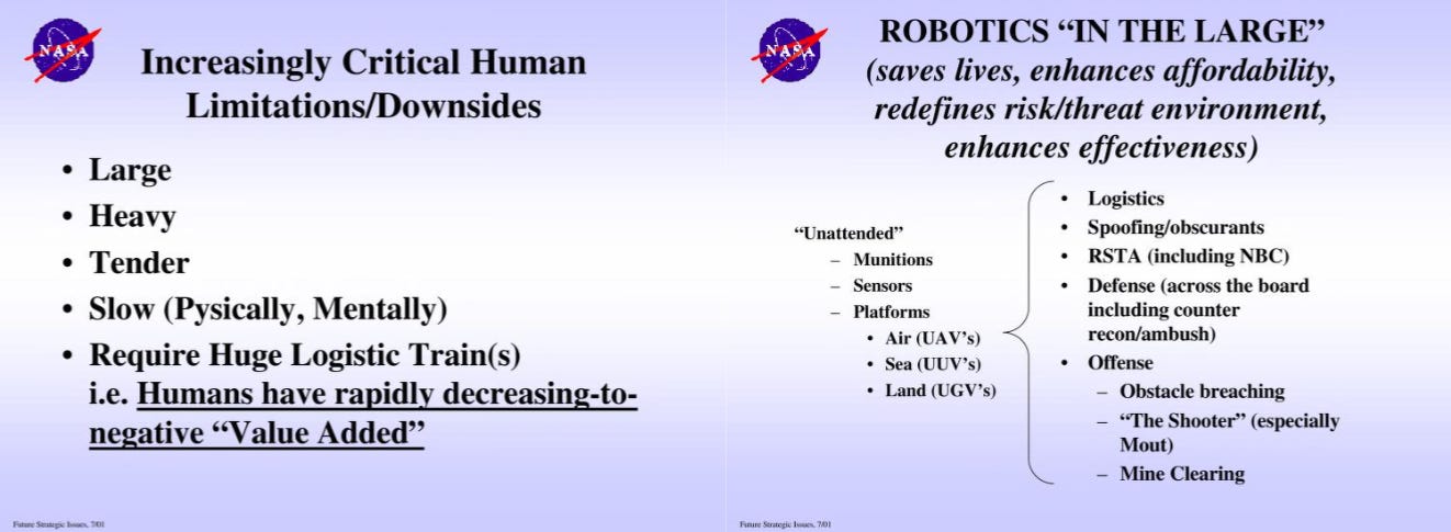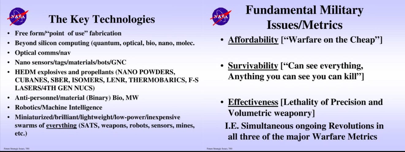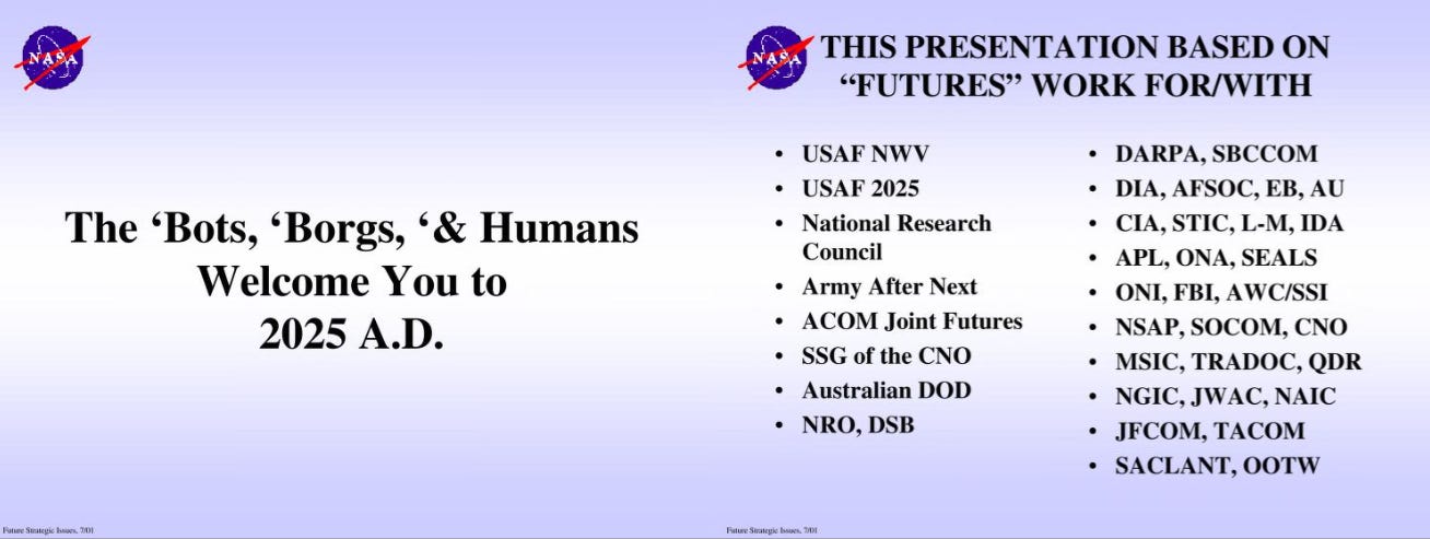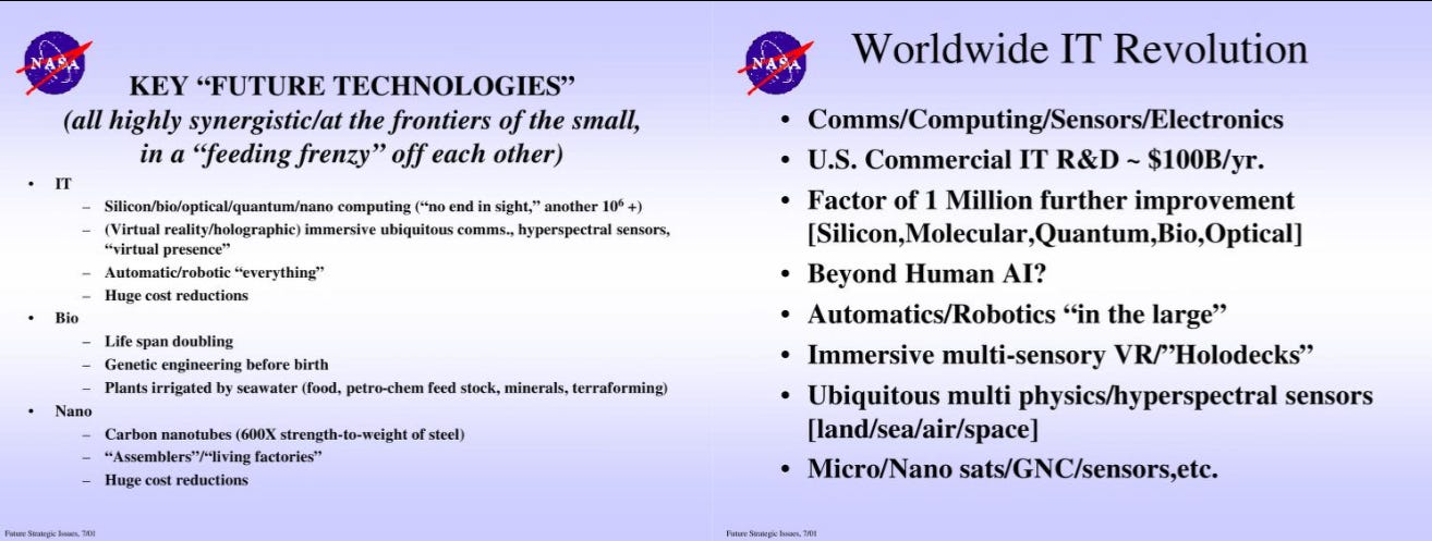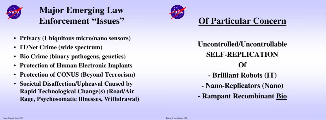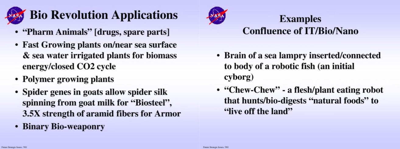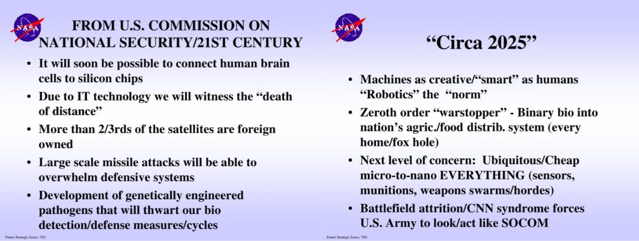 National Aeronautics and Space Administration, NASA, transhumanism, superhumanism, posthumanism, the Singularity, superintelligence, Virtual Reality, virtual worlds, biotechnology, bioengineering, biohacking, genetic engineering, directed evolution, life-extension, nanotechnology, nanoassemblers, living factories, robots, flesh-eating robots, robot swarms, self-replicating robots, replicators, nanobots, cyborgs, cybernetic organisms, artificial life, artificial neural networks, dreaming neural nets, Artificial Intelligence, AI, quantum computers, terraforming, drones, microchip implants, brain chips, Air Force 2025, torture, terrorism, bioterrorism, biowarfare, biowar, CNN Syndrome, Psychological Warfare, Psywar, Information Warfare, IW, Infowar, information dominance, robotic warfare, Robowar, Space Warfare, Spacewar, military superiority